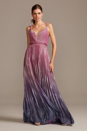 Metallic Pleated Ombre Gown with Plunge Illusion