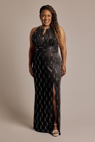 Show off your style in a metallic sequin sheath gown. The cinched waist detail and keyhole neckline enhance your natural curves and create a beautiful silhouette for any event.