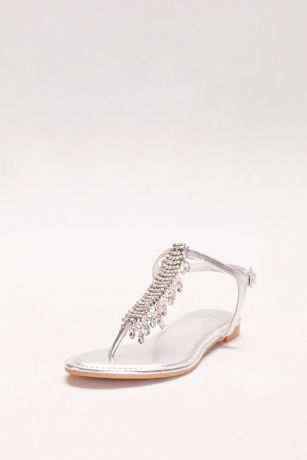 Luxurious dripping crystals give these metallic T-strap sandals the feel of fine jewelry.