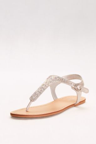 These simple summer sandals are festively blinged out with iridescent crystal accents, perfect for outdoor weddings or strolling the beach.