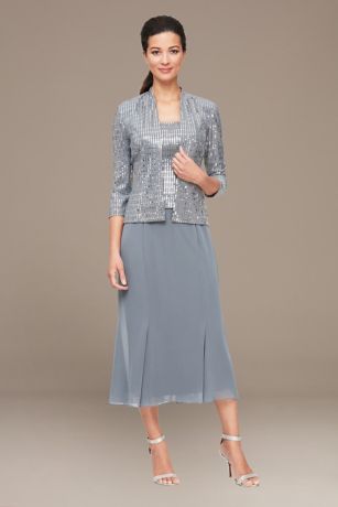 Shine like the star you are in this sequin metallic and chiffon two-piece A-line set, featuring a square-neck tank dress and matching open jacket.