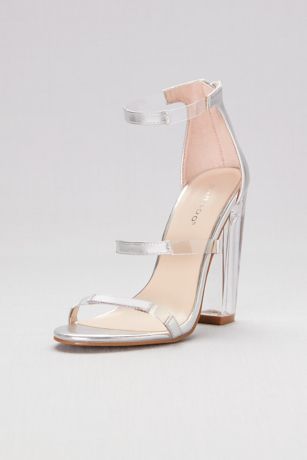 Clear accents and a chunky Lucite heel give these strappy metallic sandals a barely there feel.