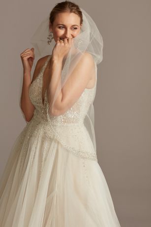 A classic mid-length veil is finished with a statement edge of crystal- and sequin-encrusted filigree.