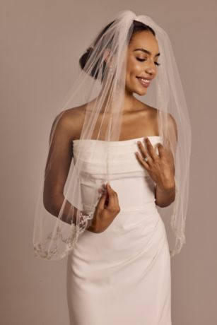 A stunning addition to your bridal look, this mid-length veil is trimmed with metallic embroidery featuring crystals, beads, and faux pearls.