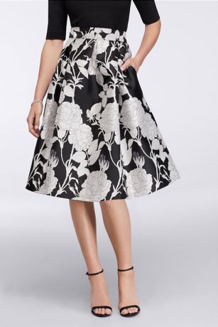 Elegant satin jacquard blooms with an oversized floral pattern in graphic black and white. This supremely feminine skirt has an inset waistband for flattering definition and box pleats for added fullness.