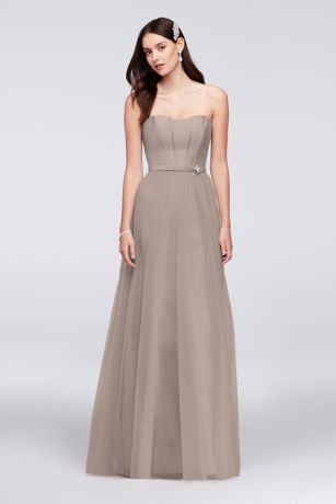 The seamed, corset-style strapless bodice and flowing tulle skirt of this long bridesmaid dress hints at the high-fashion heritage of Oleg Cassini's opulent wedding gowns. Finished with a crystal brooch on the satin waistband, this gown is a lovely balance of simple and embellished.