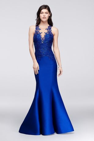 This sophisticated silhouette is crafted of lustrous, structured mikado, and finished with illusion appliques at the straps and deeply plunged neckline. This style is exclusive to David's Bridal.