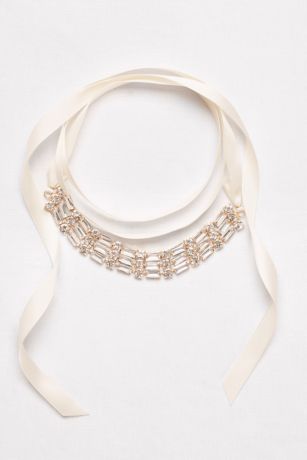 Finished with sparkling baguettes, this slim wrap choker is an on-trend adornment.