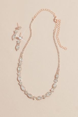 Your quincea era look will be even more regal when topped with this matching jewelry set, featuring a necklace and earrings encrusted with crystals.