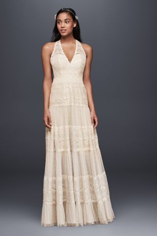 Light, airy, and perfect for a beach ceremony, this plunging halter A-line dress features alternating bands of delicate lacework and dotted point d'esprit tulle, and is infused with a bit of comfy stretch.