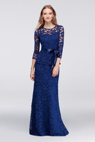 Perfectly chic and always flattering, this mock two-piece ensemble has a graceful fit-and-flare skirt and feminine floral lace bodice with illusion neckline and three-quarter sleeves. A wide satin sash that ties in a bow makes the perfect finish.