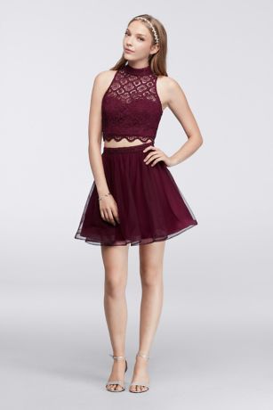 This two-piece homecoming set is all about contrasts. The mock neck of the lace crop top juxtaposes with a mesh horsehair-trimmed skirt.