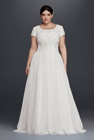 This modest A-line wedding dress with short sleeves provides just the right amount of coverage. The beaded bodice adds that dose of bridal shine you're craving.