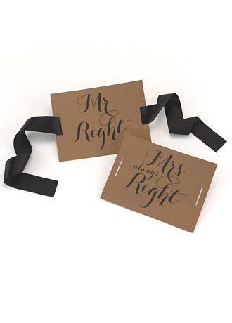 Inject some humor into the wedding reception with these fun chair banners for the newly married couple! Two kraft paper signs are printed in black ink saying "Mr. Right" and "Mrs. Always Right".