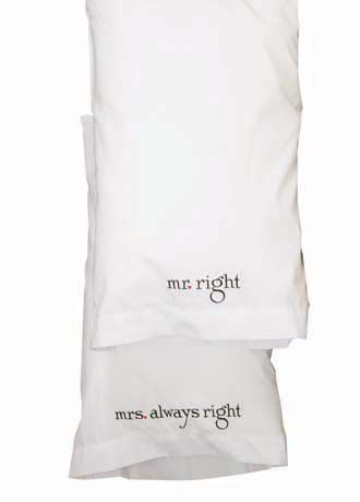 A humorous play on words will make these pillowcases a hit with the new bride and groom! White pillowcases are embroidered in black with "mr. right" and "mrs. always right", punctuated with small red hearts.