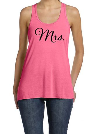 This trendy Mrs. racerback tank top has a light and flowy fit for a sporty yet feminine effect. It will make a cute honeymoon tank to show off your newlywed status! Pefect for a Bachelorette Party!