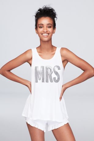 Sweet dreams are guaranteed in this silky jersey sleep set, featuring sequined "Mrs." lettering on the breezy tank and matching, ruffled shorts.