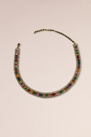 This dazzling choker necklace features multicolor baguette crystals bordered by smaller crystals that sparkle from all angles.