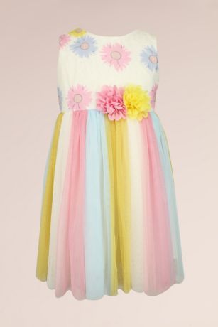 Every little lady will love wearing this dress featuring a floral print bodice, two bright flower appliques, and a charming, multicolored tulle skirt.