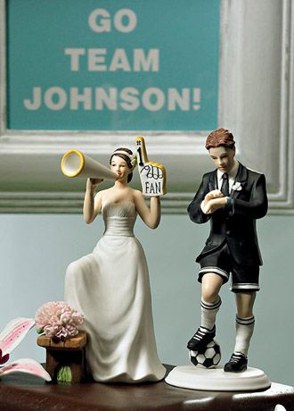 This Cheering Bride is clearly a big fan of her new Groom. Partnered here with Soccer Fanatic Groom. Each figurine sold separately to allow mixing and matching as desired to create the perfect couple. Made of hand painted porcelain it is a high quality figurine that can be enjoyed as a keepsake for years after the wedding. The cake topper weighs 0.5 lbs and is 3.75 long, 4.5 wide and 6.5 tall. Presently this cake topper is available with skin tones and hair colors only as shown and is sold 1/pk.