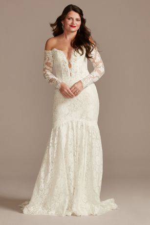 A beautiful look for the bold bride, this chic lace wedding dress features a deep-plunge, off-the-shoulder bodice and a trumpet skirt. Subtle details like eyelash-lace trim, covered buttons, and carefully strewn crystals add sophisticated finishing touches.