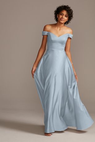 This elegant satin bridesmaid dress offers a fresh take on tradition. Luminous shine, a flattering off-the-shoulder neckline, and convenient side pockets enhance the classic A-line silhouette and add an element of sexy sophistication.