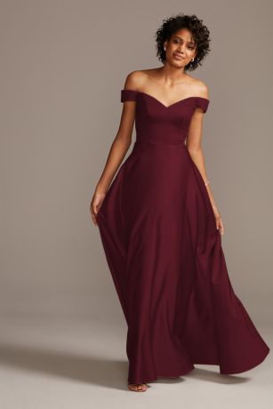 This elegant satin bridesmaid dress offers a fresh take on tradition. Luminous shine, a flattering off-the-shoulder neckline, and convenient side pockets enhance the classic A-line silhouette and add an element of sexy sophistication.
