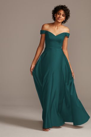 This elegant satin bridesmaid dress offers a fresh take on tradition. Luminous shine, a flattering off-the-shoulder neckline, and convenient side pockets enhance the classic A-line silhouette and add an element of sexy sophistication.