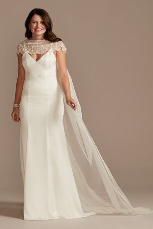 Detailed with a beaded geometric motif, scalloped edges, and a long tulle sweep train, this off-the-shoulder cape is an ultra-romantic way to complete your wedding look.