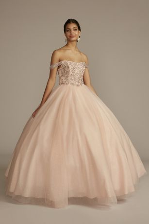 Celebra tus quince anos con estilo! A beautifully beaded bodice with off-the-shoulder sleeves sits atop the full ball gown skirt of your dreams. Glitter tulle will have you feeling like a princess as you twirl across the floor throughout your day.