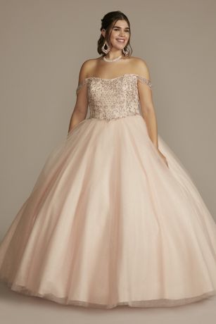 Celebra tus quince anos con estilo! A beautifully beaded bodice with off-the-shoulder sleeves sits atop the full ball gown skirt of your dreams. Glitter tulle will have you feeling like a princess as you twirl across the floor throughout your day.