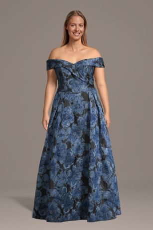 This off-the-shoulder brocade A-line dress pairs timeless elegance with modern ease. The structured silhouette and luxe texture flatter beautifully, while hidden pockets add a practical touch that's perfect for mothers of the bride or groom.