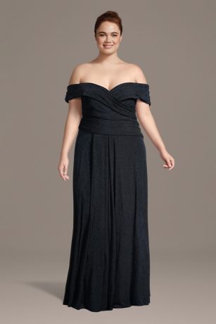 This off-the-shoulder A-line dress features a beautifully draped bodice made to flatter mothers of the bride or groom. Effortlessly elegant, it?s a timeless choice.