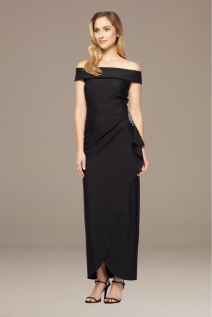 Elevate your formalwear in this off-the-shoulder gown. A cascade ruffle and sparkle embellishment at the hip makes for a silhouette-defining shape, while a tulip hem gives texture and movement.
