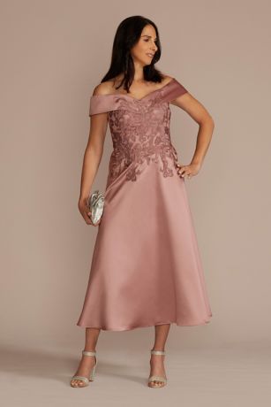 Soft and feminine, this tea length A-line dress features a beautifully embroidered bodice, with detailing over the sweetheart neckline and off-the-shoulder sleeves. Glossy satin fabric makes this a polished option for any mother of the bride or groom.