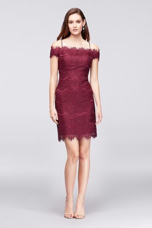 On-trend style with a romantic side, this off-the-shoulder cocktail dress features fluttery eyelash lace scallops at the neckline and hem.