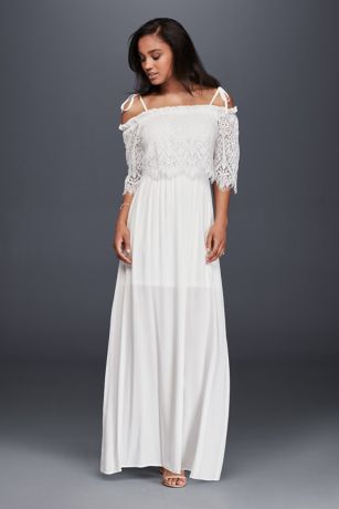 A wedding dress with an easy feel is a must-have for many modern brides. This lacy one perfectly fits the bill, with its spaghetti strap bodice, elasticized waist, open back, and long flowy skirt.