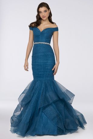 A dramatic mermaid silhouette, an off-the-shoulder neckline, and a jeweled waistline lend this dress glamorous details, while allover shirring and a flounced hem add texture.
