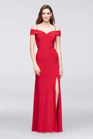 Sleek and chic, this slinky jersey gown features a pretty off-the-shoulder collar and spaghetti straps.