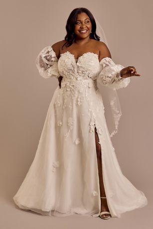 Your outdoor ceremony is the perfect backdrop for this bohemian off-the-shoulder wedding dress. Lace appliques cover the long billow sleeves and sweetheart neckline bodice before trailing down the voluminous full skirt, complete with a slit for easy movement.