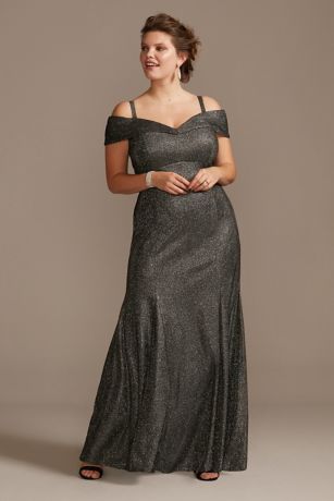 Turn heads in this metallic stretch-knit mermaid gown with flowy skirt godets that add fluttering movement to every step. The chic off-the-shoulder neckline is accented with a draped foldover and skinny spaghetti straps.