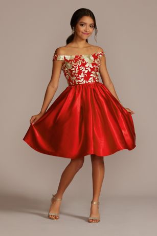 This off-the-shoulder damas dress has details sure to stun! With a radiant patterned bodice and full A-line skirt, the whole quincea era court will be dressed to perfection.