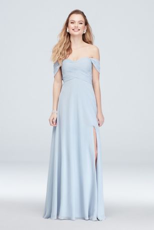 Pleated crepe panels cross over the bodice of this goddess-inspired gown, complete with a skirt slit and draped off-the-shoulder sleeve detail.