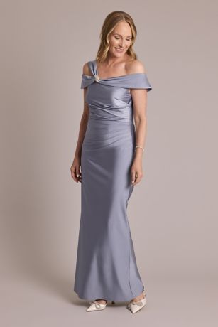 Designed with power stretch fabric, this asymmetrical off-the-shoulder sheath dress glamorously hugs your curves. A detachable brooch at the neckline adds elegant shine.