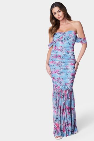 Make a statement in this off-the-shoulder print mesh gown, featuring a flattering ruched design, flowing silhouette, and eye-catching print. Perfect for glamorous evening events or formal occasions where elegance meets drama.