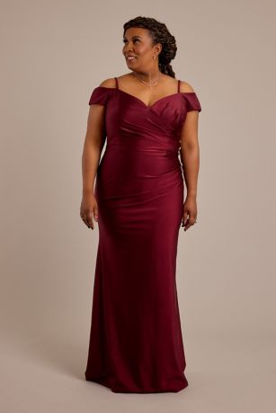 This off-the-shoulder sweetheart sheath dress is just right for every effortlessly elegant mom. Crystal buttons add even more shine to the ruched light-catching fabric for a one-of-a-kind look.