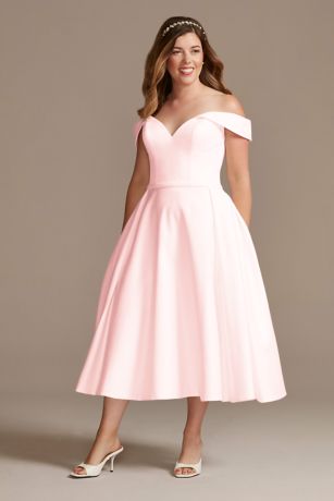 Off the Shoulder Satin Tea-Length Wedding Dress