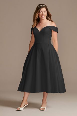 Off the Shoulder Satin Tea-Length Wedding Dress