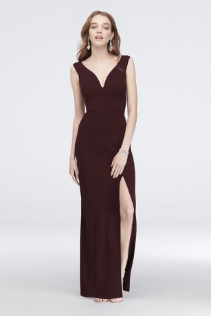 Off-the-shoulder sleeves and a low V-neckline give this stretchy scuba crepe sheath dress a sophisticated touch.