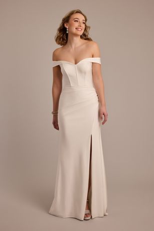 The off-the-shoulder satin sheath wedding dress from David's Bridal is a stunning choice for any bride looking for a modern and elegant gown. The sweetheart neckline adds a touch of romance, while the swag sleeves and graceful draping create a sophisticated and chic look. The skirt slit adds a touch of drama, perfect for the bride who wants to make a statement on her big day.